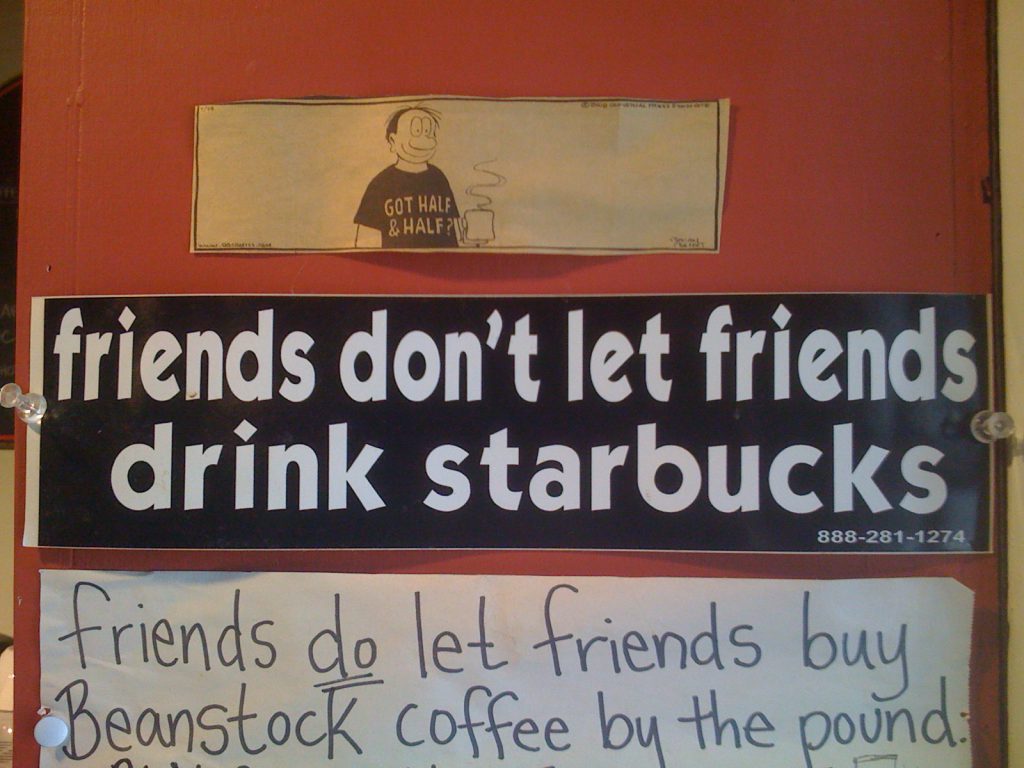 I was so driven to share my distate for Starbucks that I had Deaf Dog Coffee (RIP) send me a whole stack which I kept in the trunk of that car (1995 Passat Sedan, best car I ever owned as well). I would give them to people who would routinely flag me down and say that had to know where I got that bumper sticker!