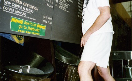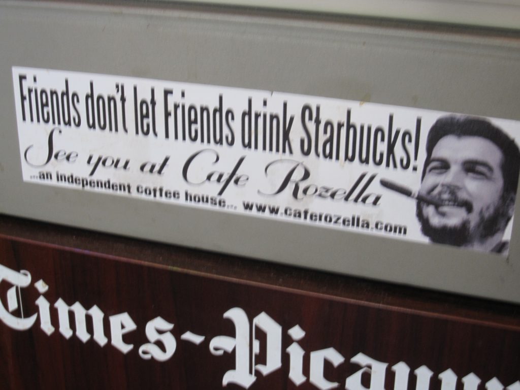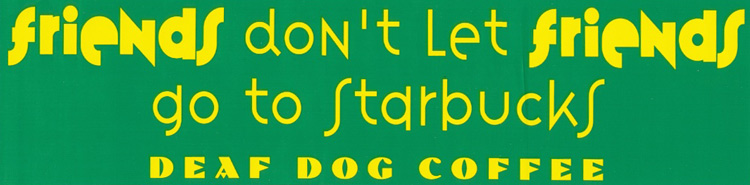 The other incidence was a friend who was making a movie in Petaluma, Ca where they local coffee place called Deaf Dog Coffee currently in the sites of a Starbucks buyout had a bumper sticker that read: “Friends don’t let friends go to Starbucks”. This is the one and only bumper sticker I have ever put in a vehicle I owned and I still have three of them in a secret hiding place. In the following years I was pulled over numerous times and asked where I got the sticker form. I got Deaf Dog to send me a bunch and started carrying them in my trunk so that when people started asking, I started delivering.