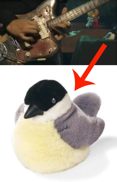 I am sitting there so enjoying a fantastic performance of the song when Jessica, my girlfriend, blurts out: “Hey, is YOUR guy there!”. OK , so we both really excitedly are watching the last few moments of the clip with Nels Cline hammerin’ out a gorgeous penultimate moment (that guy has got some massive paws) and they cut to a close up of Nels’ guitar and I see something out of the corner of the frame. I then go into Blade Runner mode and, freeze, zoom in, enhance (in my mind) and yup, bingo. There it is The Black-capped Chickadee is right there on stage with Wilco and the rest of the Guys. I was so happy. Jessica was not sure, so I went to Wild Republic to download a picture of the boid to do a side by side. There is no question. My gift made it onstage and now a little bit of me and Jess and Jack are traveling around with my favorite rick band forever. That is a good feeling!