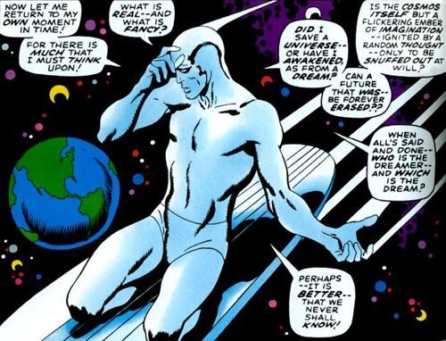 Surfer didn’t really win, but he pissed off his boss enough so that Galactus said sina-nara, but before I go I am placing an impenetrable barrier around this planet you love so much so you can stay here for eternity bitching and moaning about those earth creatures you fought so gallantly to save. So there you have it. The Silver Surfer is trapped inside an invisible barrier tethered to the planet earth for eternity, (oh yeah, Galactus also had to make his herald live forever) His board and the power cosmic his only companions. Oh, did I forget to explain the power cosmic? I am not sure why the Surfer got the power cosmic to begin with, but without it the series would have been pretty drab. The power cosmic is very hard to explain and to understand, I am not sure if the Surfer ever really understood the unlimited power that the power cosmic contained. It seems the power cosmic enabled him to will almost limitless energy into a physical reality. His power cosmic successfully beat every conceivable enemies power, and there were some doozies. One of the charms of the surfers legacy is the complete inability to define the power cosmic. No one understood what it was or how it worked, yet everyone (bad guys) coveted it. Here starts a long list of parallels one can draw between the surfer and existential beliefs. He had a power so great it could solve every problem, so powerful that it was god like, yet so mysterious that it defied interpretation. All I know is that ROCKED!