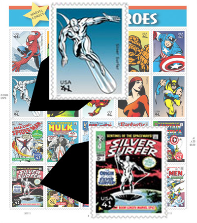 I was at one of my favorite places, the United States Post Office, when after I asked to see the selection of 41 cent stamps, my jaw hit the floor when she slapped this sheet down in front of me. I spent 82 dollars on Silver Surfer stamps and it might be the best purchase I have made in a lifetime.